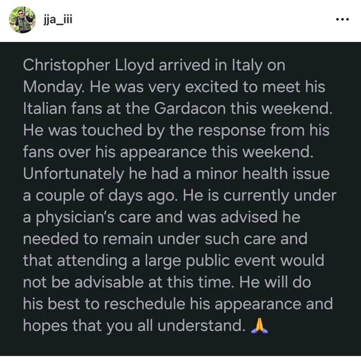 Siamo spiacenti di comunicare che, a causa di improvviso problema di salute, Christopher Lloyd non sarà presente all’evento Gardacon, in programma sabato 8 e domenica 9 novembre.